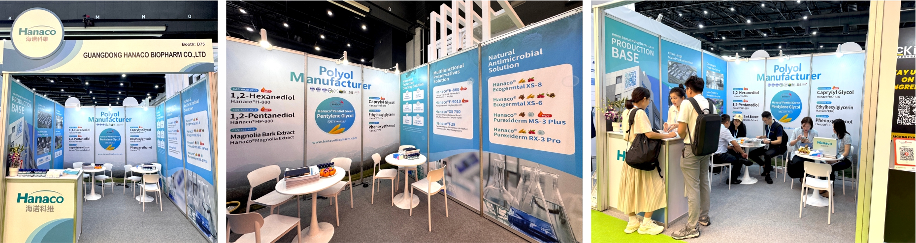 本次展会海诺科维重点展示了其核心产品线“天然抗菌方案和多功能抗菌方案”,今年带来了全新突破,海诺科维生产的所有产品已通过国际Halal清真认证,其中1,2-戊二醇更是取得了REACH认证,每一项认证都是我们对产品卓越品质与符合全球标准承诺的见证。